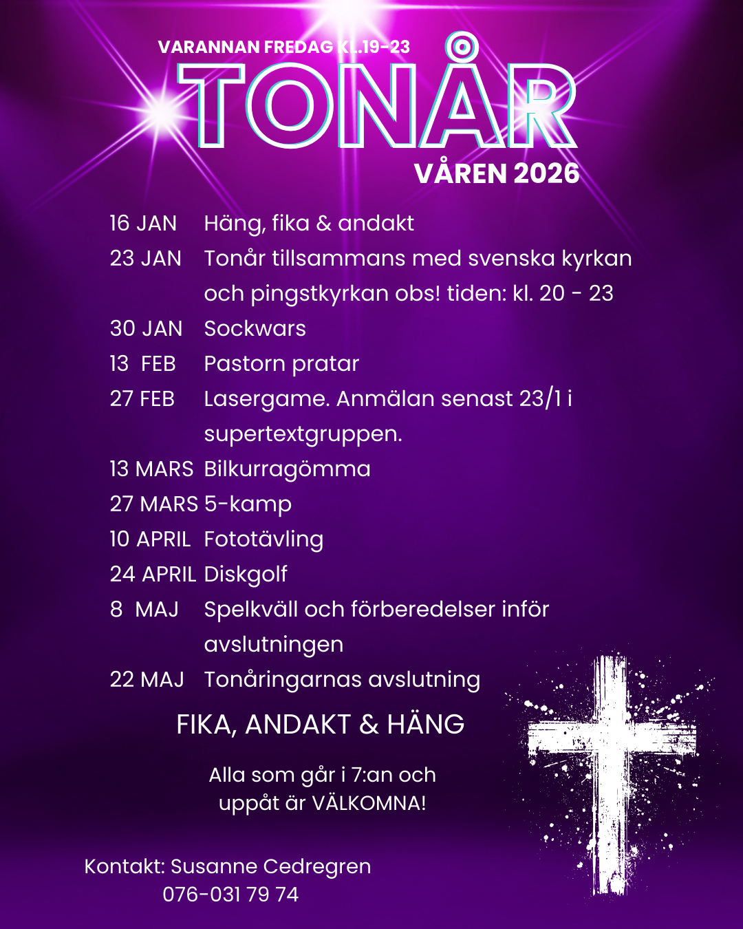 På tonår får du hänga med kompisar och vara med på olika aktiviteter t ex. spelkväll, filmkväll, bilkurragömma, skattjakt och sockwars. Utöver det har vi alltid andakt, fika och så klart även tid att bara chilla