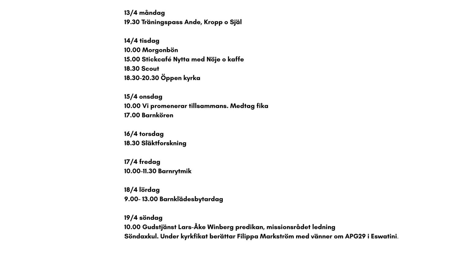 Nyhet Bytardag 18/4 kl.9-13 Publicerat 2026-04-01 Välkommen på bytardag i Missionskyrkan! Här finns barnkläder, leksaker och annat som hör barnen till. Allt är secondhand. Caféet... Läs vidare